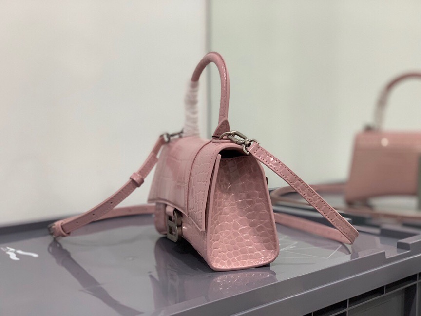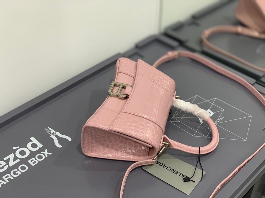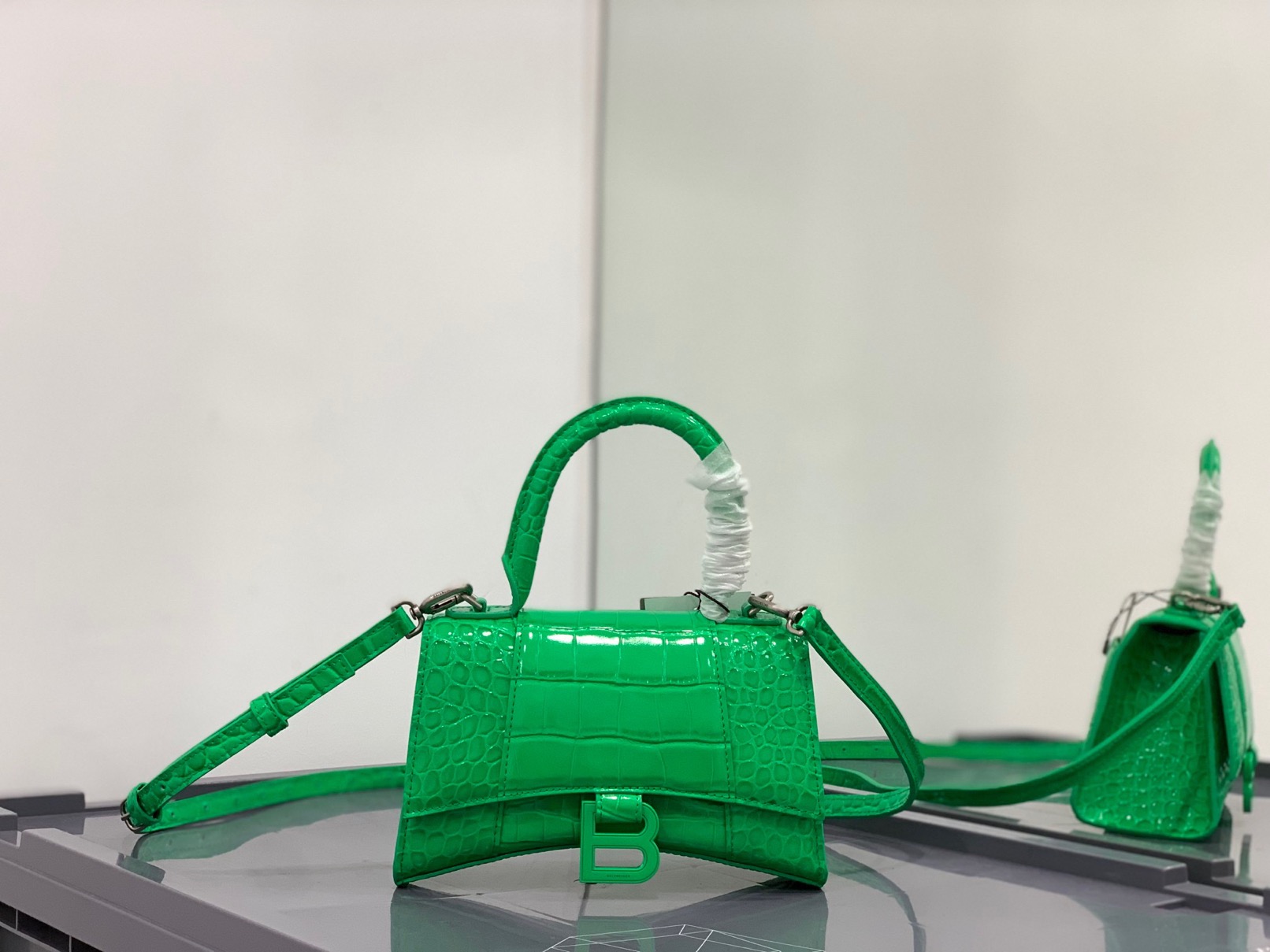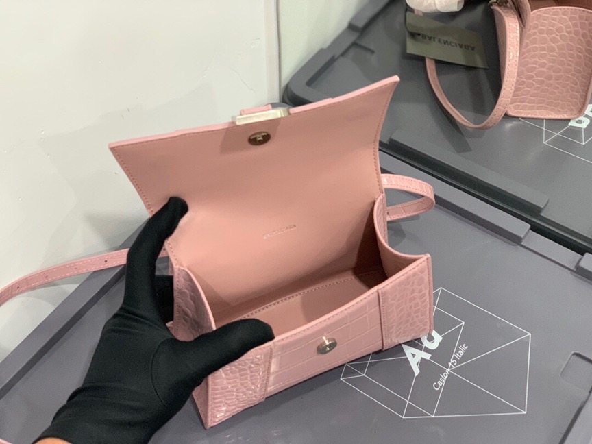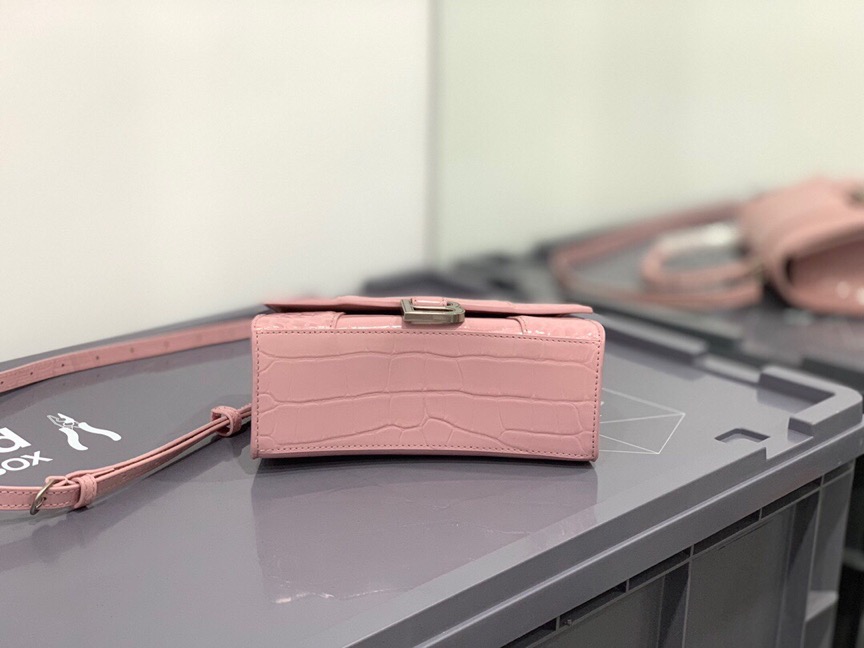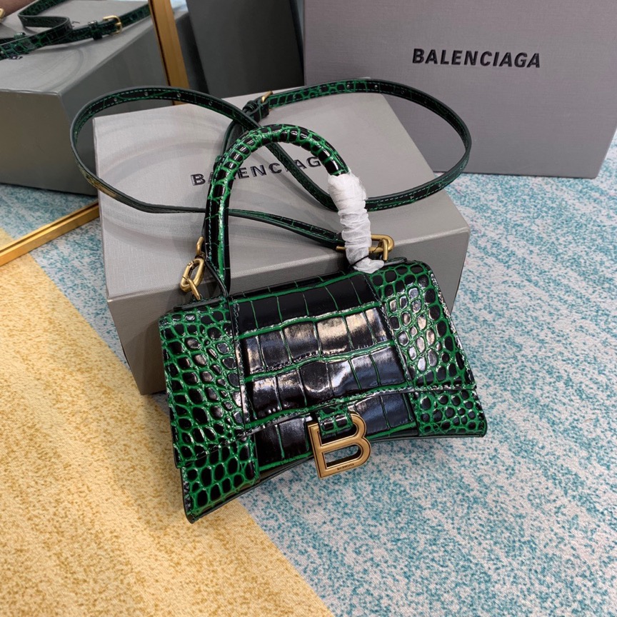 The Hourglass XS bag is beautifully crafted with bold lines that pay homage to the impeccable tailoring of Cristóbal Balenciaga. Its exquisite croc-effect embossing on the leather is meticulously created using a unique metallic matrix, resulting in a stunning texture that perfectly resembles scales. This bag effortlessly elevates any outfit, whether worn crossbody, over the shoulder, or carried gracefully in hand.