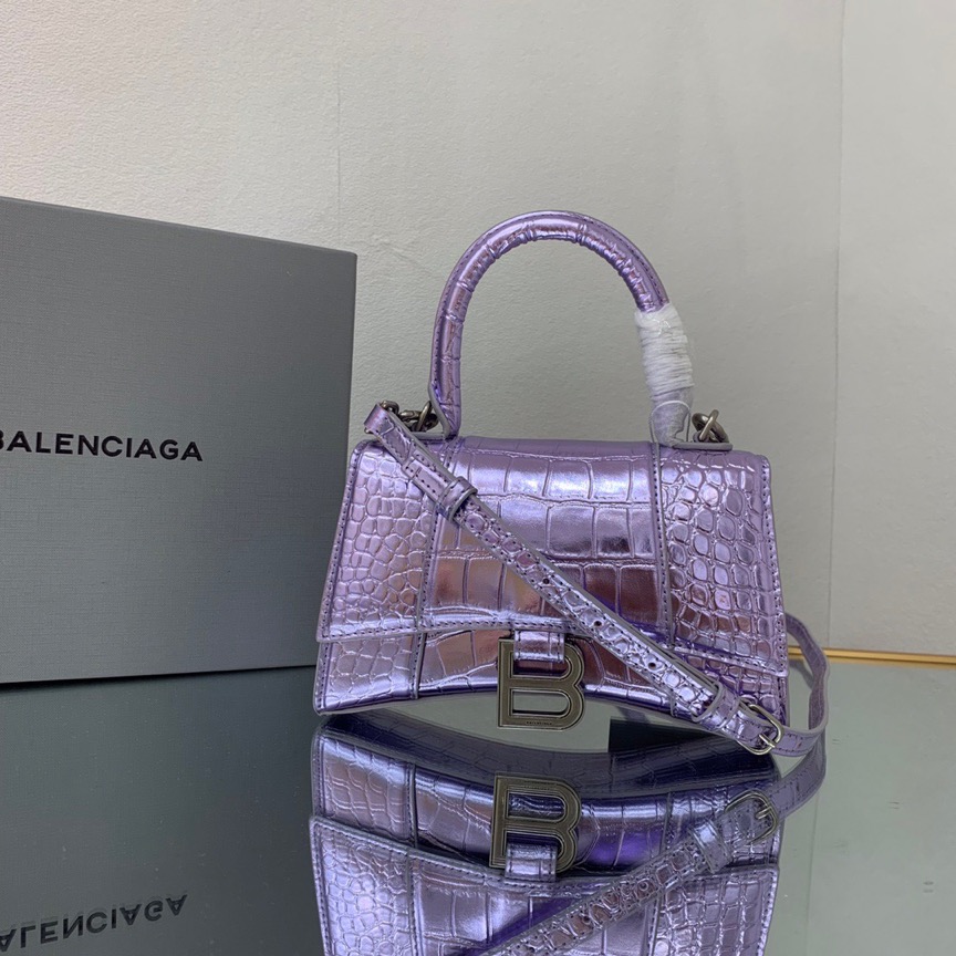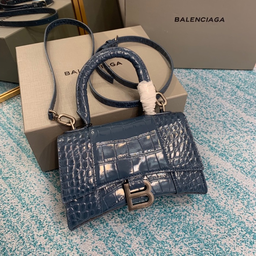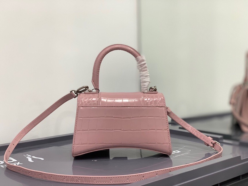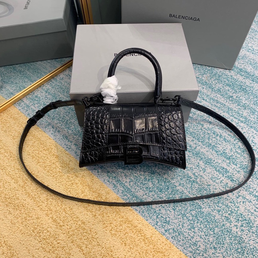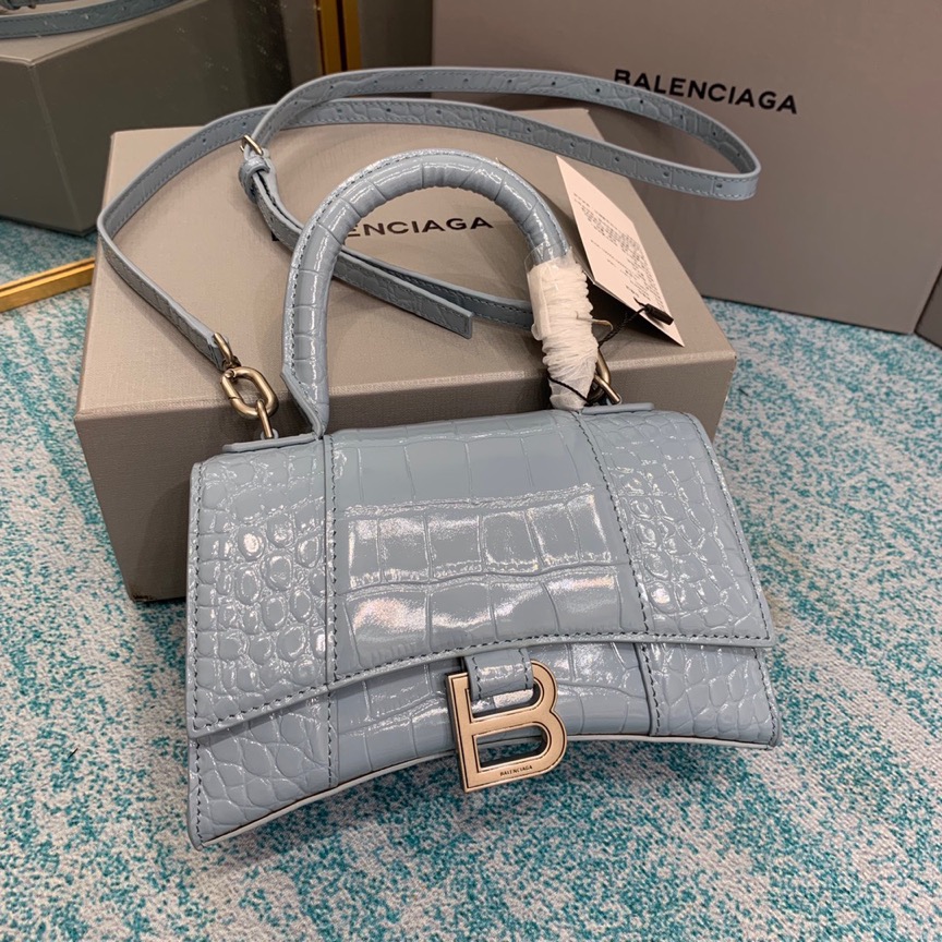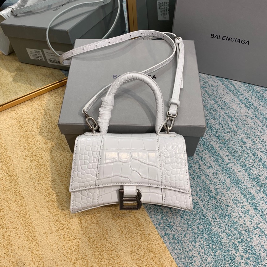 The Hourglass XS bag is beautifully crafted with bold lines that pay homage to the impeccable tailoring of Cristóbal Balenciaga. Its exquisite croc-effect embossing on the leather is meticulously created using a unique metallic matrix, resulting in a stunning texture that perfectly resembles scales. This bag effortlessly elevates any outfit, whether worn crossbody, over the shoulder, or carried gracefully in hand.