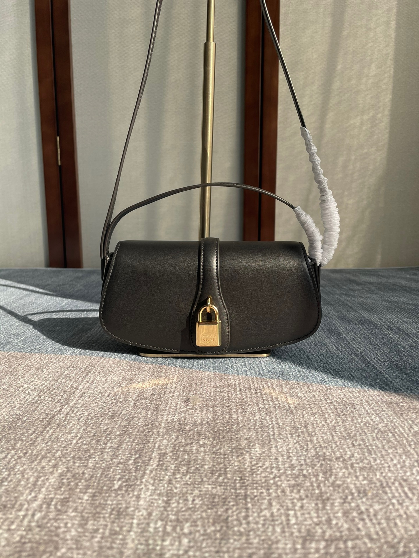 *eline has truly outdone themselves with this exquisite small bag, which showcases their exceptional design skills in a minimalistic edition. The standout feature of this bag is the remarkable leather strap that elegantly connects to the ornamental lock, boasting a beautifully large and shimmering gold hardware. This captivating lock will undoubtedly steal all the attention. To cater to various carrying preferences, the bag is equipped with a convenient short-handle for hand-carry, while also providing a long leather strap for shoulder carry. The slender and delicate appearance of the straps adds a touch of femininity to this delightful creation.