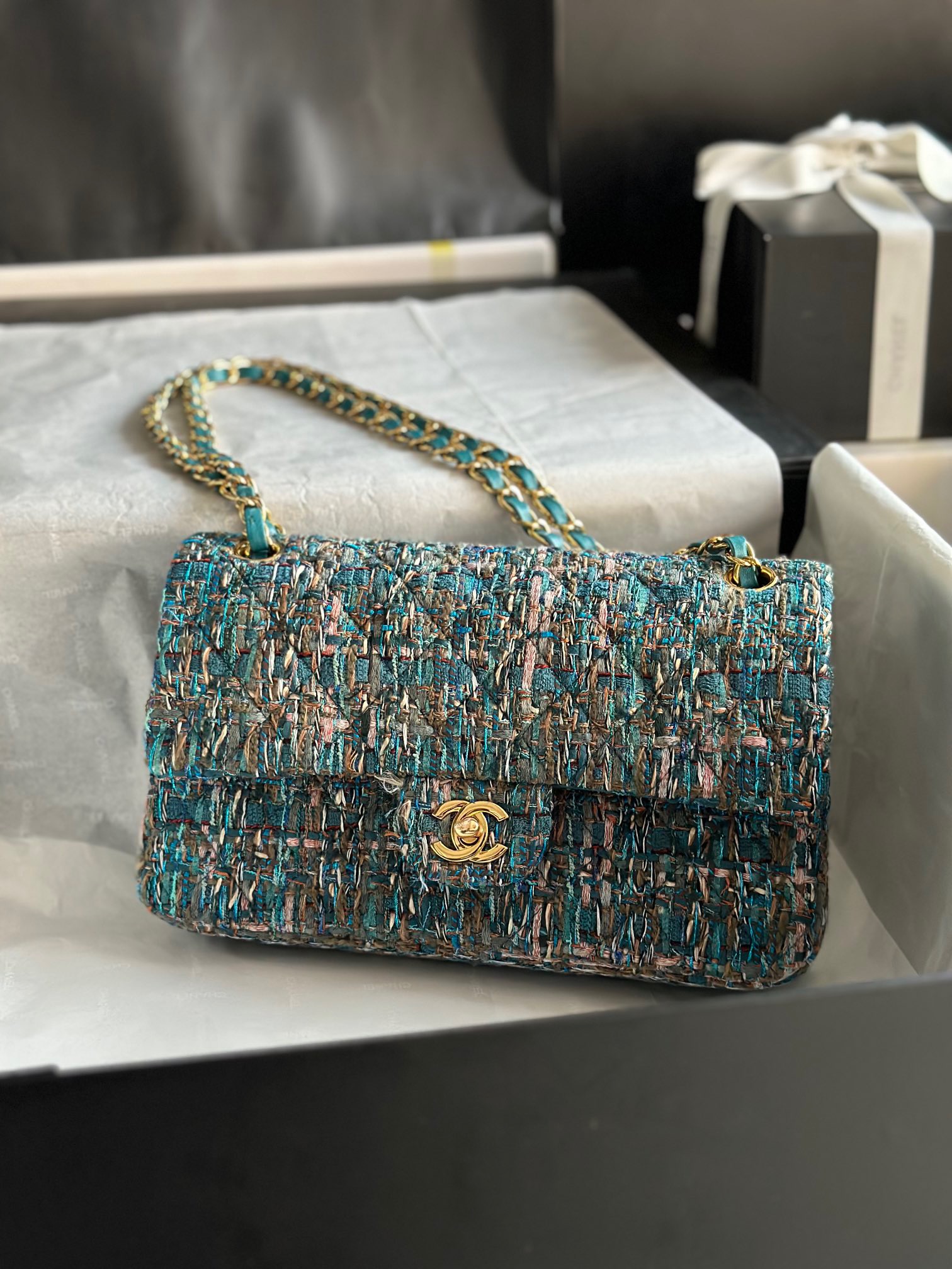 The introduction of these vibrant and eye-catching bags is simply captivating. The standout feature of this collection lies in the meticulously crafted chain and diamond quilting patterns. Additionally, our seasonal bags bear a striking resemblance to the timeless Classic Flap Bags, yet they are enhanced with an infusion of colorful cotton tweed, resulting in even more luminosity. Undoubtedly, these must-have seasonal bags are a brilliant addition to any wardrobe.