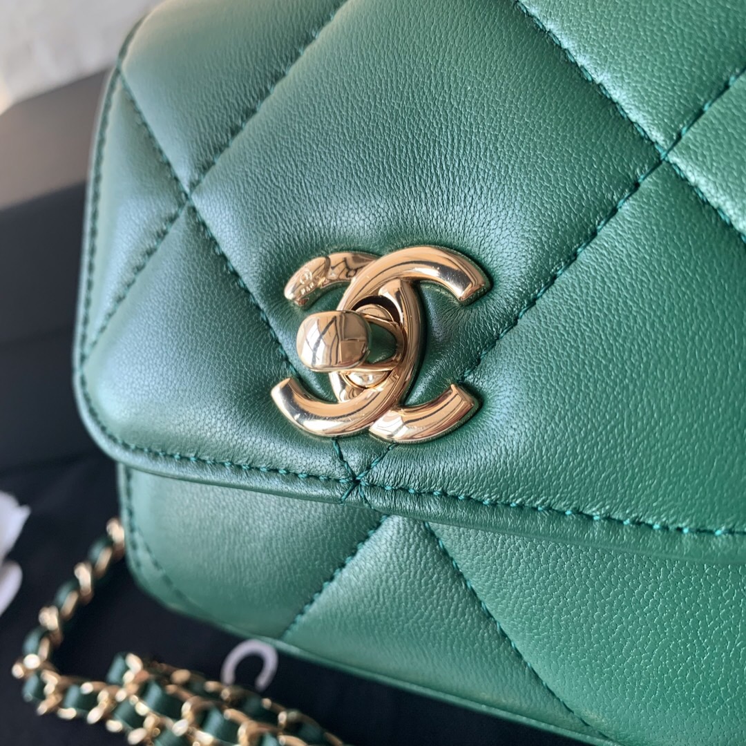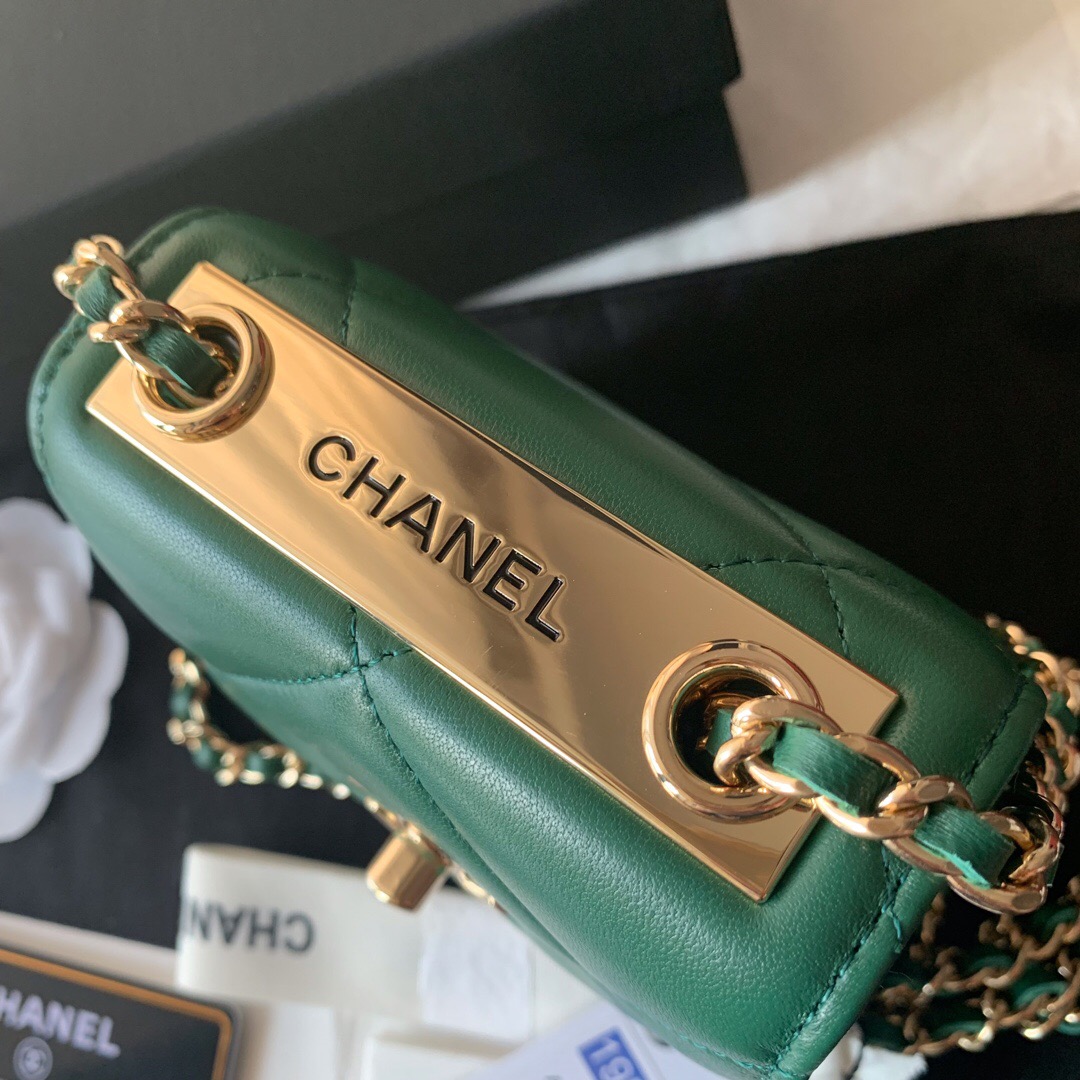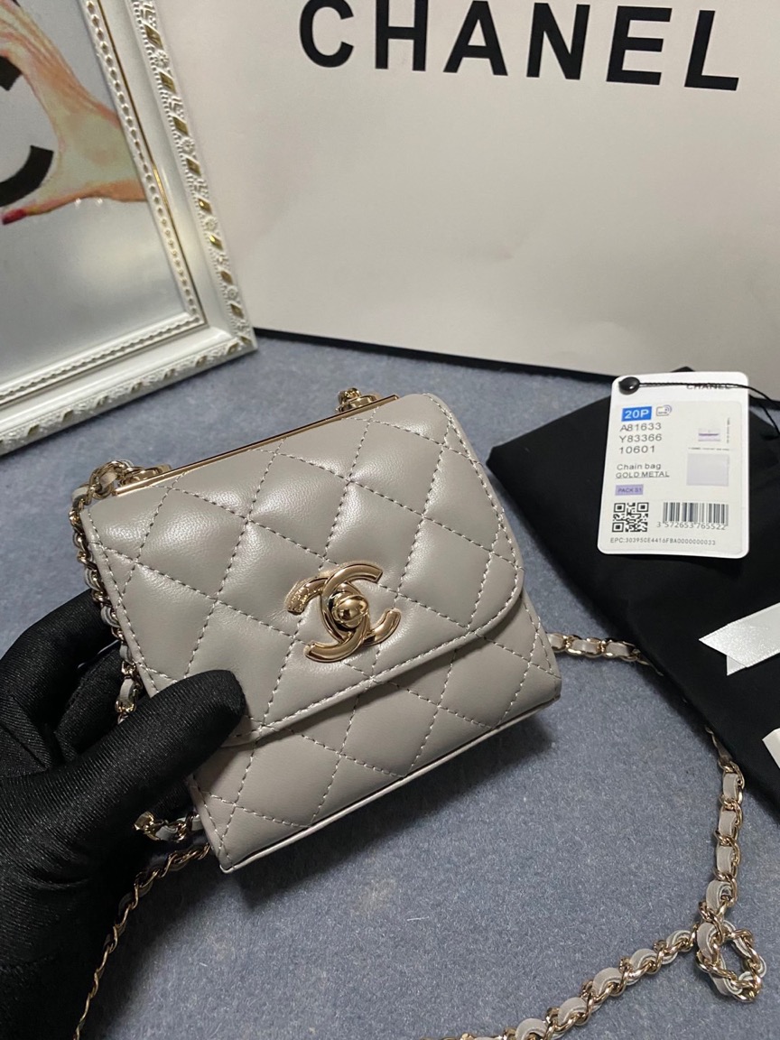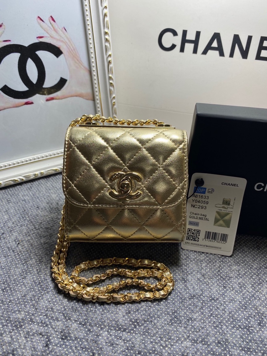 Introducing the *ANEL CC Clutch with Chain – a sophisticated and trendy accessory crafted with utmost care from luxurious quilted lambskin leather. This exquisite clutch showcases a beautifully woven leather chain strap, along with a flawless logo metal plate and aged gold-tone hardware. Unlock its elegance with a convenient turn-lock closure, revealing a refined black fabric interior adorned with practical slip pockets.