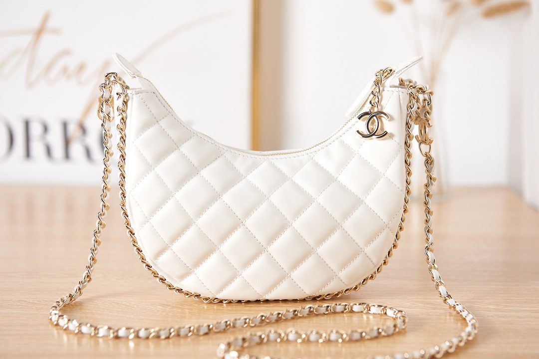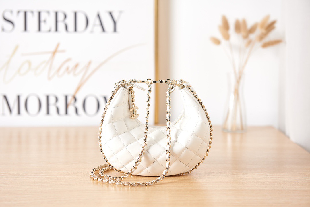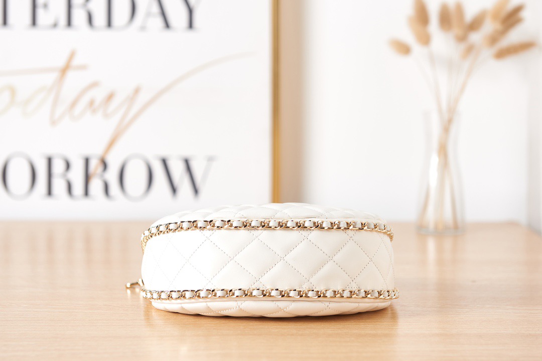 Introducing the Small Hobo Bag from the sensational Cruise 2022/23 collection, a true masterpiece both in terms of functionality and elegance. Meticulously crafted from luxurious lambskin leather, it boasts glistening light gold-tone hardware, adding a touch of sophistication. Accompanied by a long chain, this bag offers the convenience of shoulder carry, making it a perfect companion for any outing.