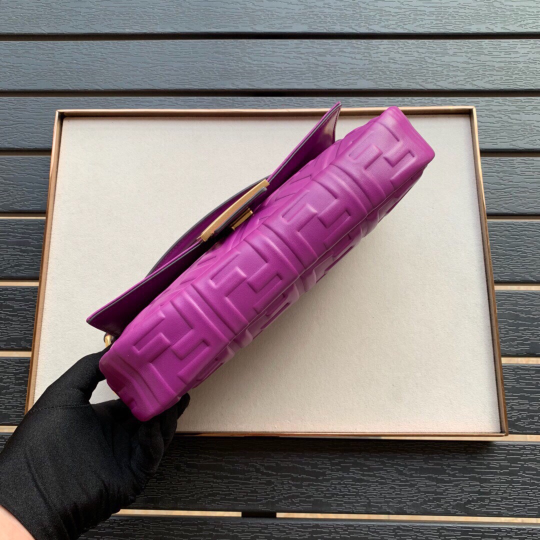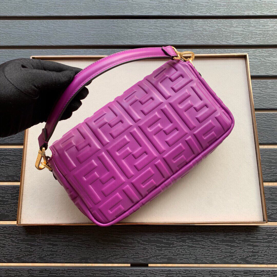 The iconic Baguette bag in large size, with flap and FF fastening with a magnetic clasp. Lining with a zip pocket. It can be carried by hand or worn cross-body thanks to its handle and shoulder strap, both detachable. Made of lambskin with an all-over FF motif in a soft, three-dimensional texture. Metal hardware.