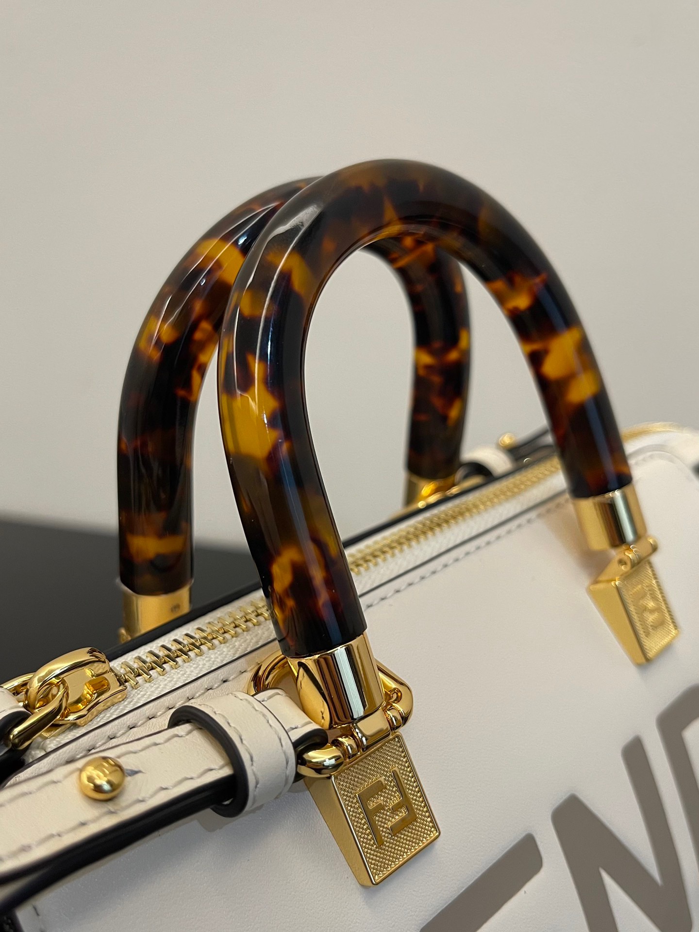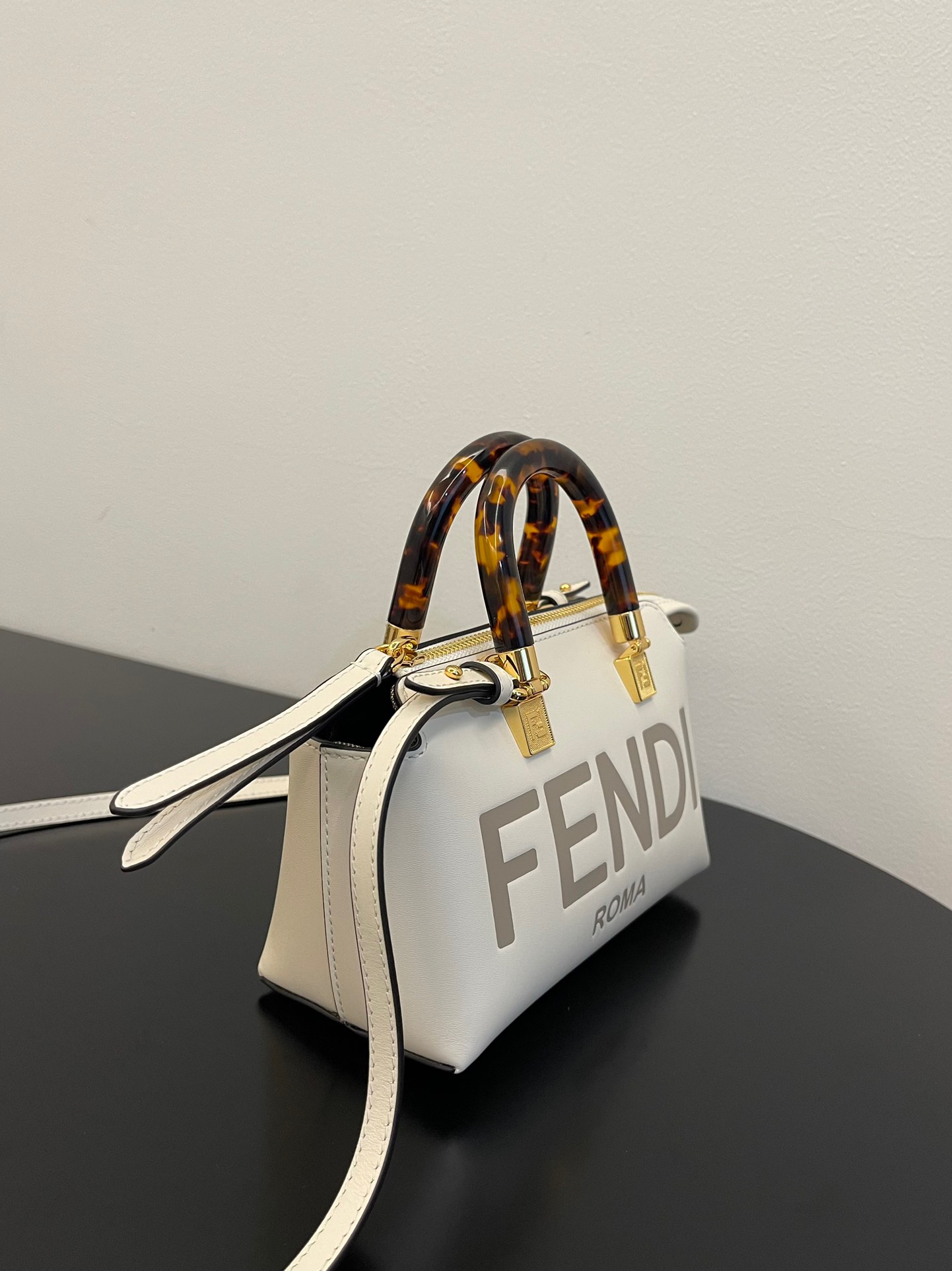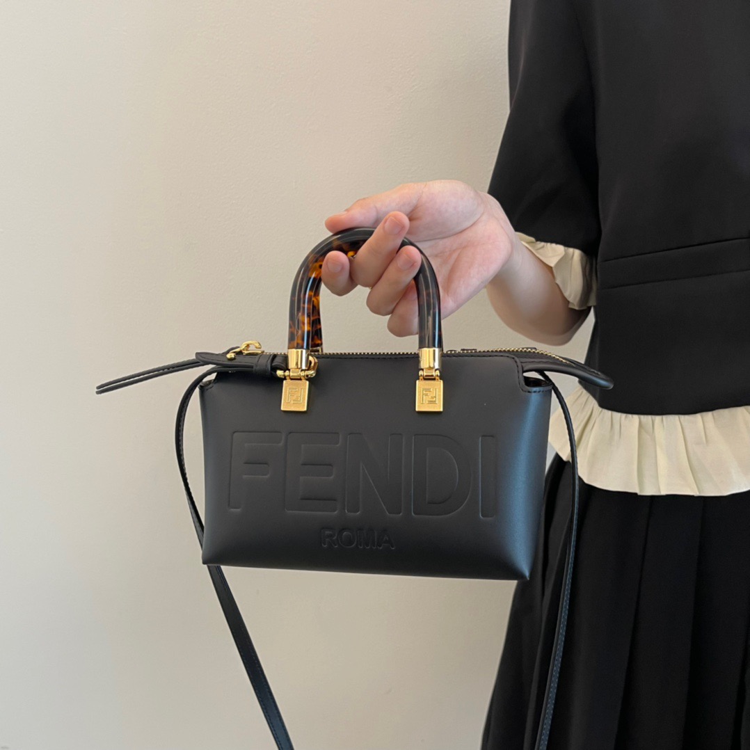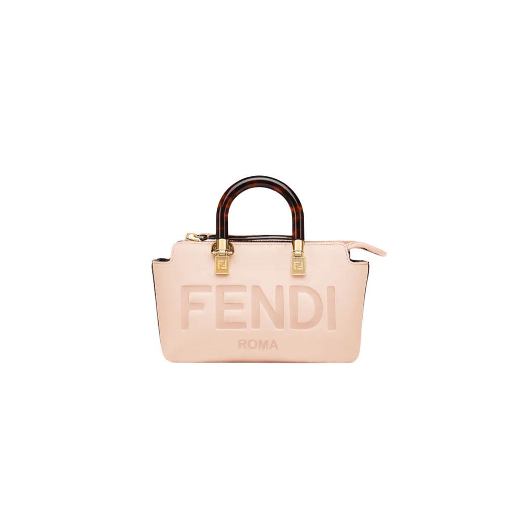 Introducing the iconic mini By The Way Boston bag, crafted from luxurious leather and embellished with the hot-stamped *ENDI ROMA lettering. Its rigid handles are adorned with a exquisite tortoiseshell-like plexiglass finish. The bag’s zip fastening opens to reveal a fabric-lined interior, complete with a convenient pocket and elegant gold-finish metalware. Versatile in nature, this bag can be carried by hand using the handles, or worn effortlessly on the shoulder or cross-body thanks to the detachable shoulder strap.
