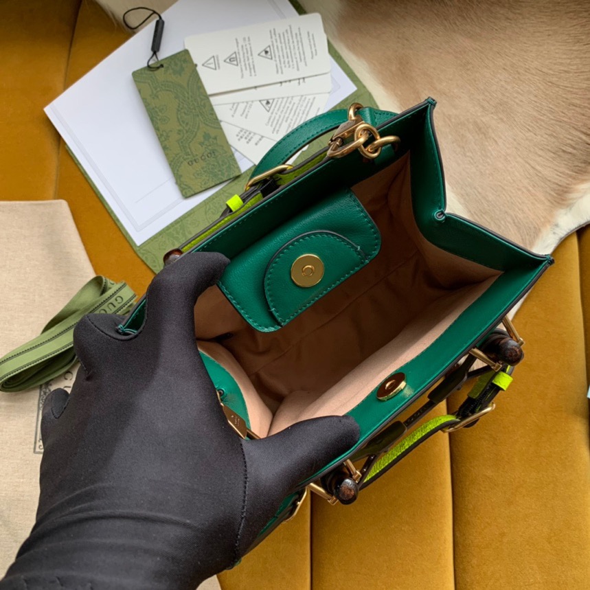 The mini tote bag beautifully blends iconic features of the House, with its bamboo handles and Double G hardware. Crafted from luxurious leather, this accessory is made even more eye-catching with the addition of two vibrant neon bands. These bands playfully allude to the ones traditionally used to maintain the handles’ shape.