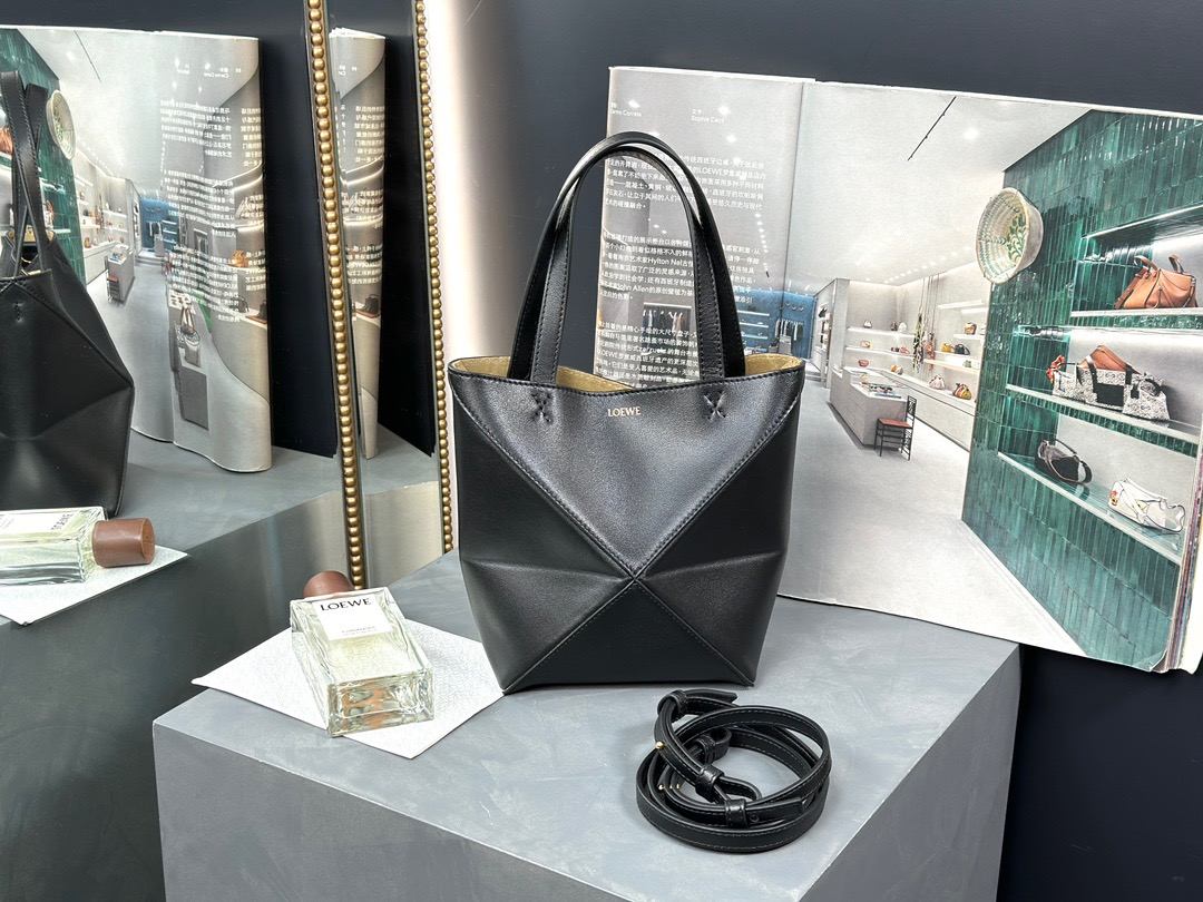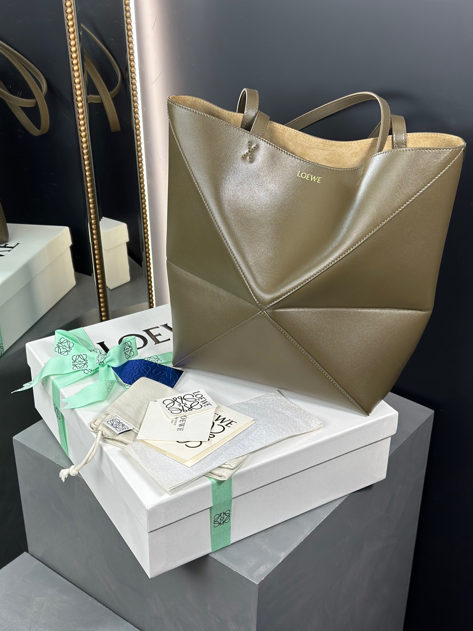 The Puzzle Fold Tote seamlessly incorporates the iconic bag’s distinctive geometric design into a visually striking and architecturally inspired series of panels. This innovative construction enables the bag to fold completely flat, making it an ideal travel companion. Crafted with care, this medium-sized version is fashioned from shiny calfskin, boasting a soft and lightweight feel. It exudes elegance with its discreet *OEWE branding.