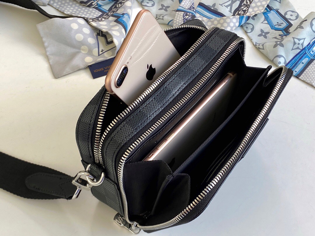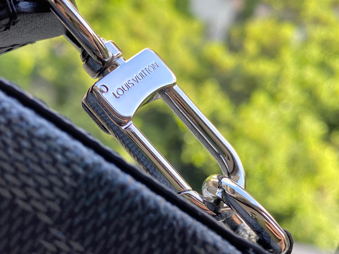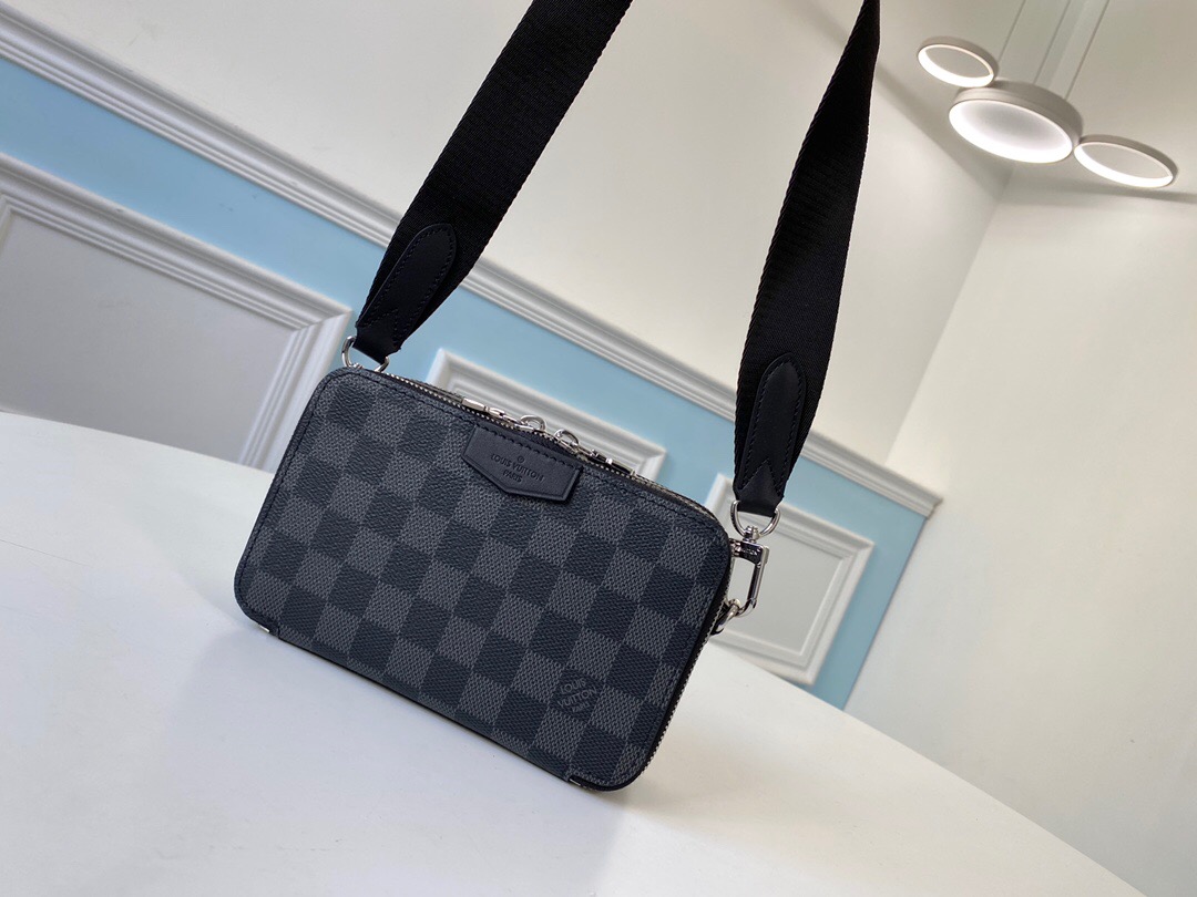 Introducing the Alpha Wearable Wallet, a truly versatile and sleek compact bag designed to adapt to your unique needs. With its adjustable and removable strap, this bag effortlessly transitions between different carrying styles. Crafted from high-quality Damier Graphite canvas and accented with elegant black leather trim, it exudes a sophisticated and modern appeal. The spacious wide opening, along with side gussets, ensures easy access to your essentials. Whether it’s holding your phone, multiple phones, or a phone and a wallet, this bag proves to be the perfect companion.