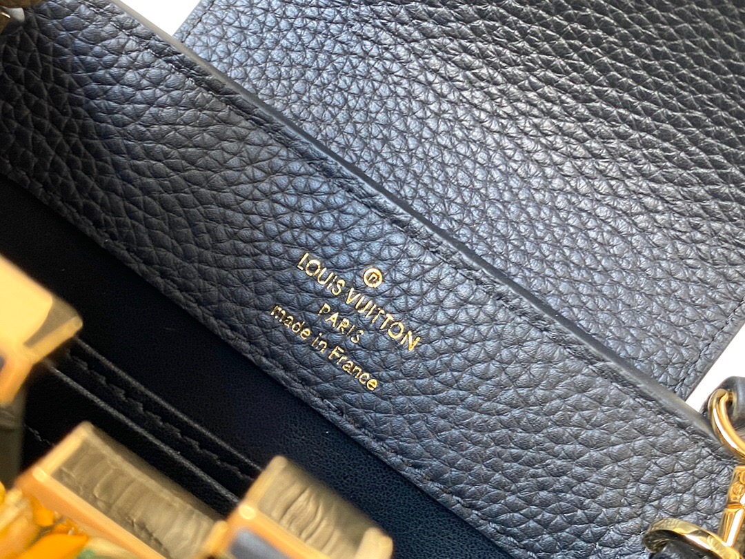 Crafted from vibrant Taurillon leather, the Capucines Mini handbag exudes an exquisite charm. Its striking color palette is tastefully enhanced by the understated metal handle rings. Just like every Capucines, this Mini version can be effortlessly carried with the flap out, adding an air of effortless elegance, or tucked inside to showcase the iconic LV Initials.