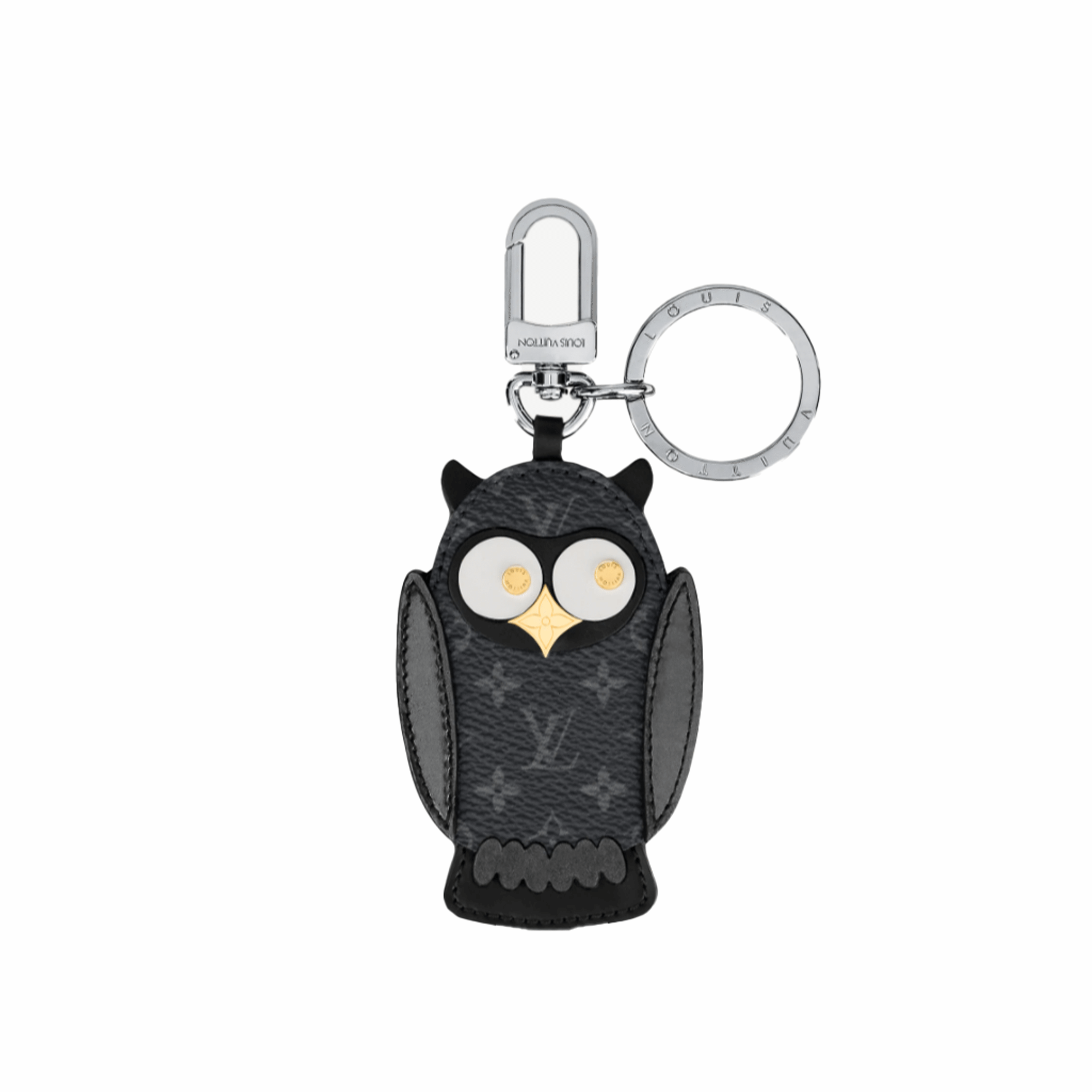 The Owl bag charm and key holder showcases a lively mascot, adorned with LV stud eyes and a Monogram Flower beak. This charming accessory combines gold-color hardware, expertly blending calf leather and Monogram Eclipse canvas – both iconic materials of the House. The refined hook and ring are exquisitely engraved with the *OUIS *TON signature, adding an elegant touch to its overall design.
