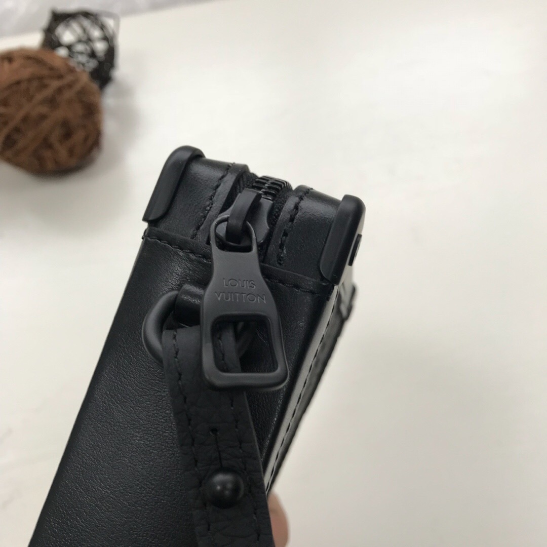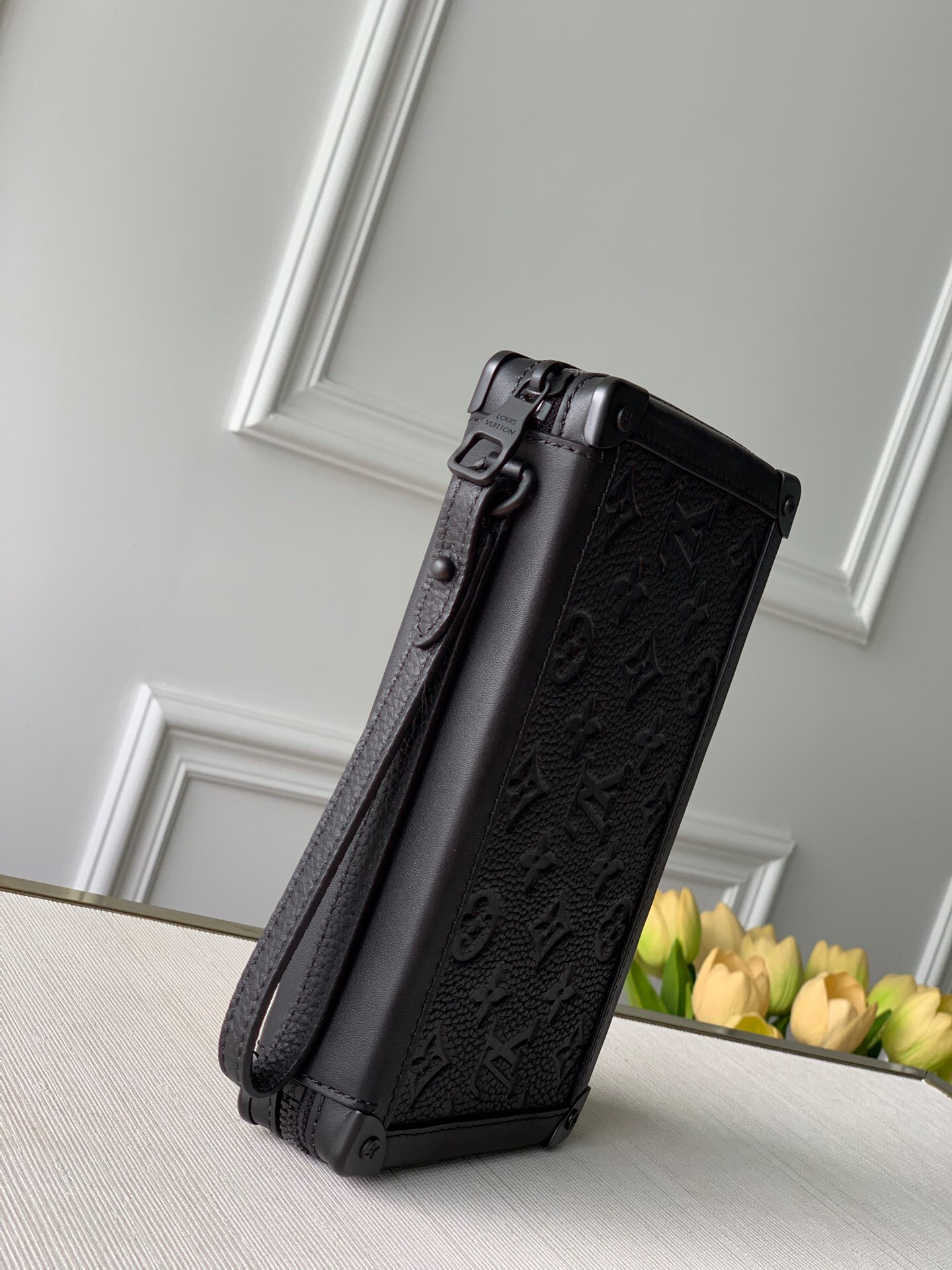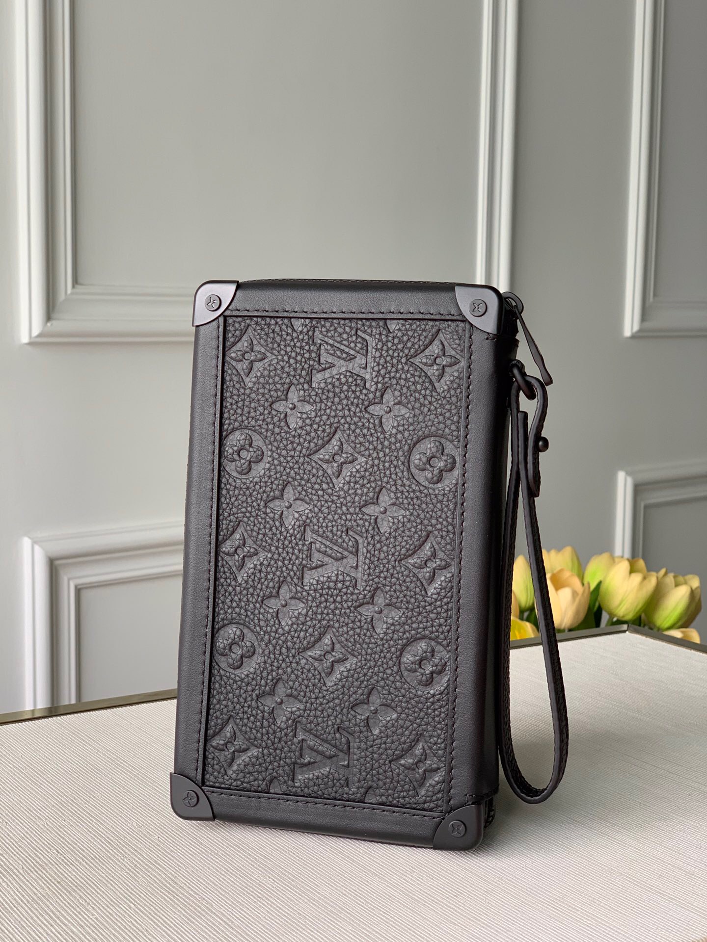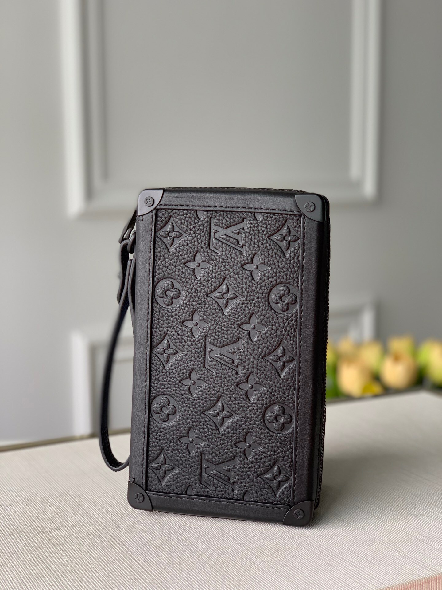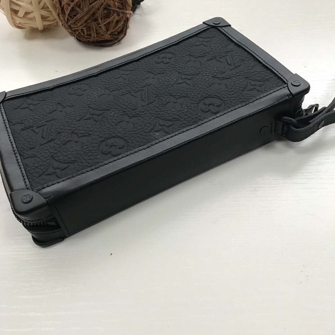 Introducing the sleek Soft Trunk Clutch designed specifically for men. Meticulously crafted from luxurious black Taurillon leather, this exquisite accessory features an embossed Monogram pattern. Boasting a refined rectilinear form and compact dimensions, it effortlessly accommodates your essential items such as a phone, earbuds, and credit cards. With a wide zipped opening for easy access and a removable wristband, it provides utmost practicality and convenience.