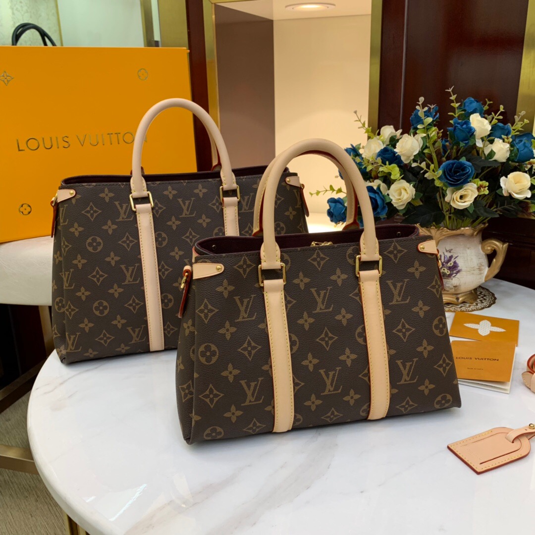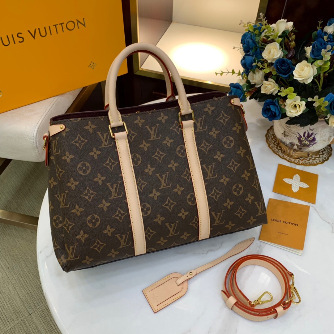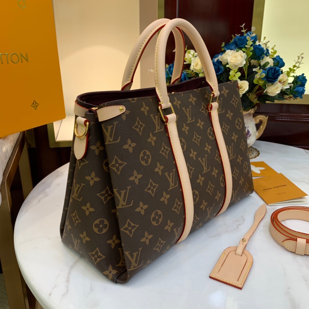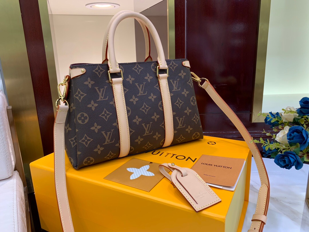 The sophisticated Soufflot MM is skillfully crafted with Monogram canvas, complemented by two stylish leather bands reminiscent of the famous Keepall design. Its capacious interior is thoughtfully arranged for optimal organization. This versatile bag can be carried gracefully by hand or on the elbow, thanks to its refined leather top handles, or effortlessly draped over the shoulder, courtesy of its adjustable and detachable shoulder strap.