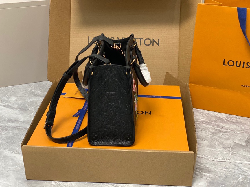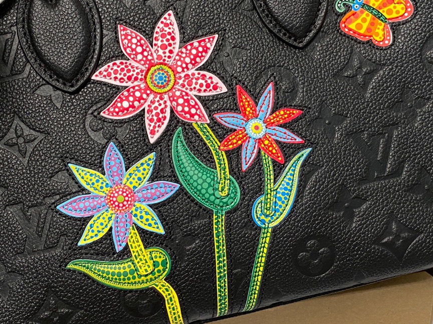 The LVxYK OnTheGo PM bag is a true work of art, showcasing exquisite marquetry with three delightful flowers and a butterfly. Yayoi Kusama, the brilliant artist behind the Louis Vuitton x Yayoi Kusama collection, draws inspiration from her upbringing surrounded by roses in her family’s plant nursery in Japan, resulting in breathtaking masterpieces depicting these flowers. Crafted with the utmost precision using Monogram Empreinte cowhide, this bag is a remarkable tribute to art and the exceptional craftsmanship.