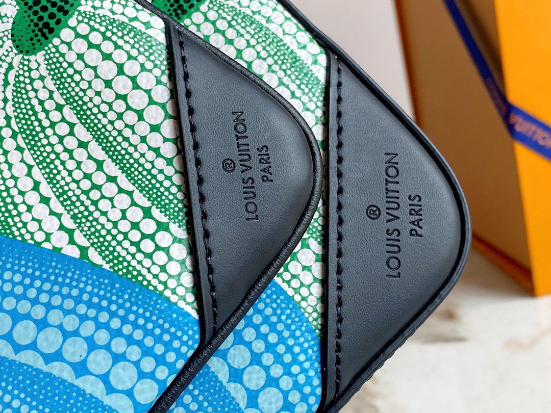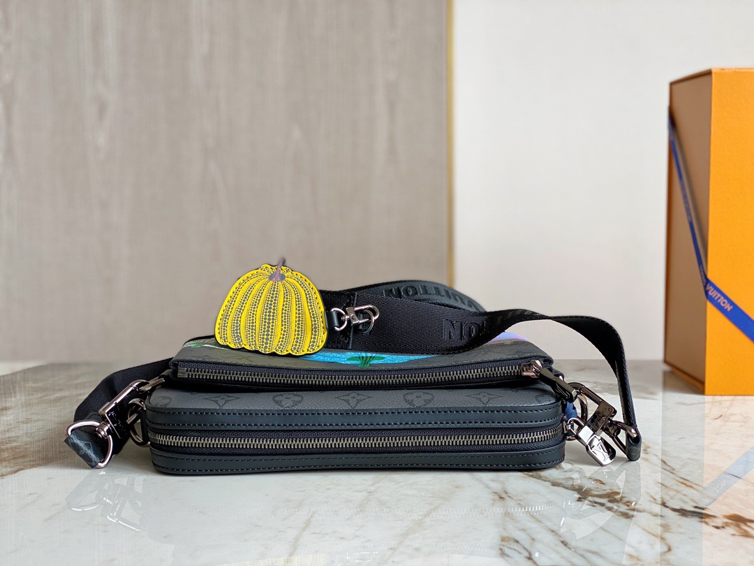 LV X Yayoi Kusama Trio Messenger. Authentic quality luxury bag crafted in genuine leather comes with authenticity card, dust bag and gift bag. A masterpiece of functionality and artistic expression.