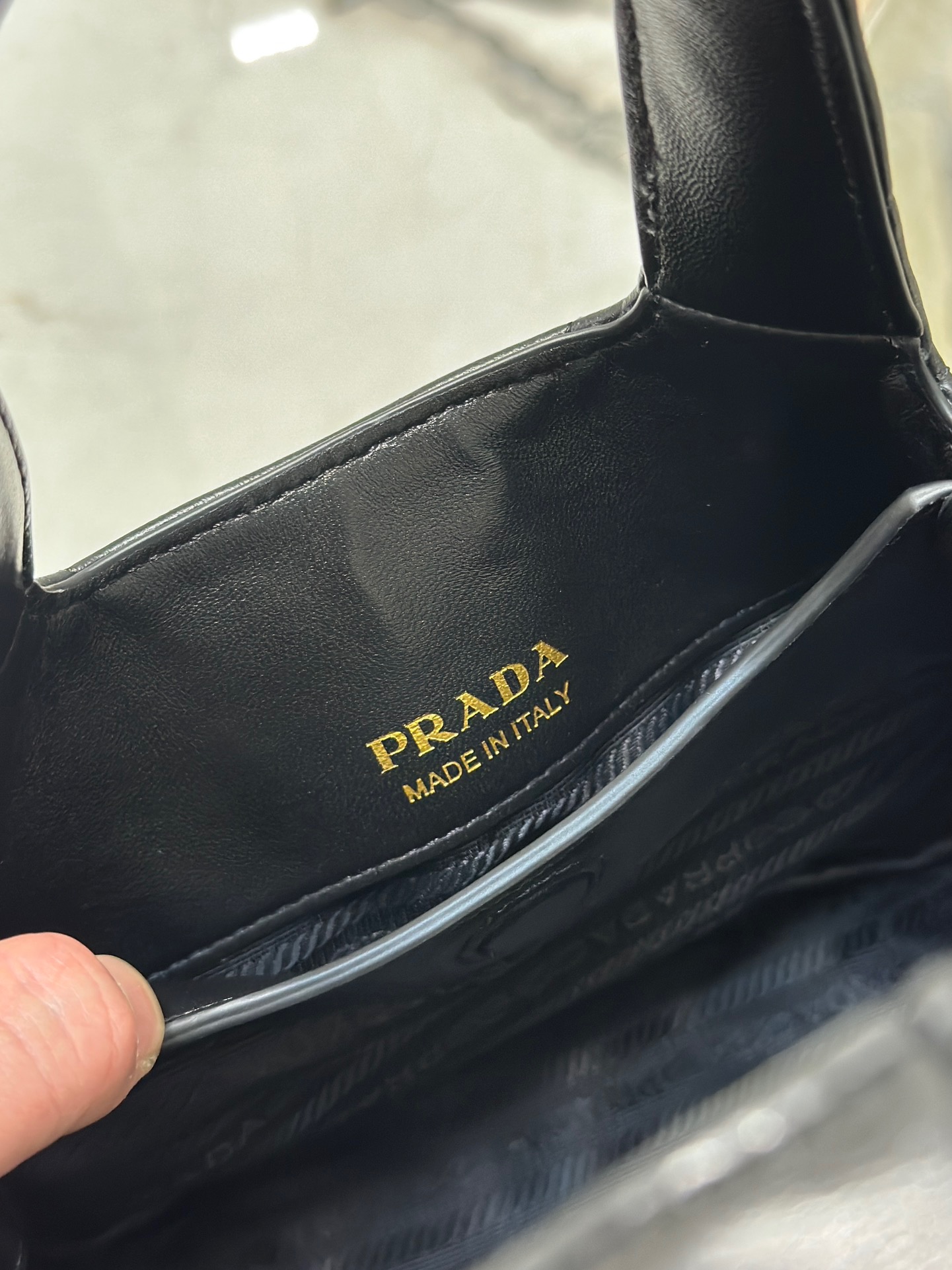 This nappa-leather shopper bag showcases a unique triangle motif that adds a captivating three-dimensional effect. It cleverly reimagines the iconic Pr*da shape, creating a distinct design. The bag boasts a versatile appeal and is finished with a magnetic clasp and the renowned enameled-metal triangle logo, signifying its authenticity.