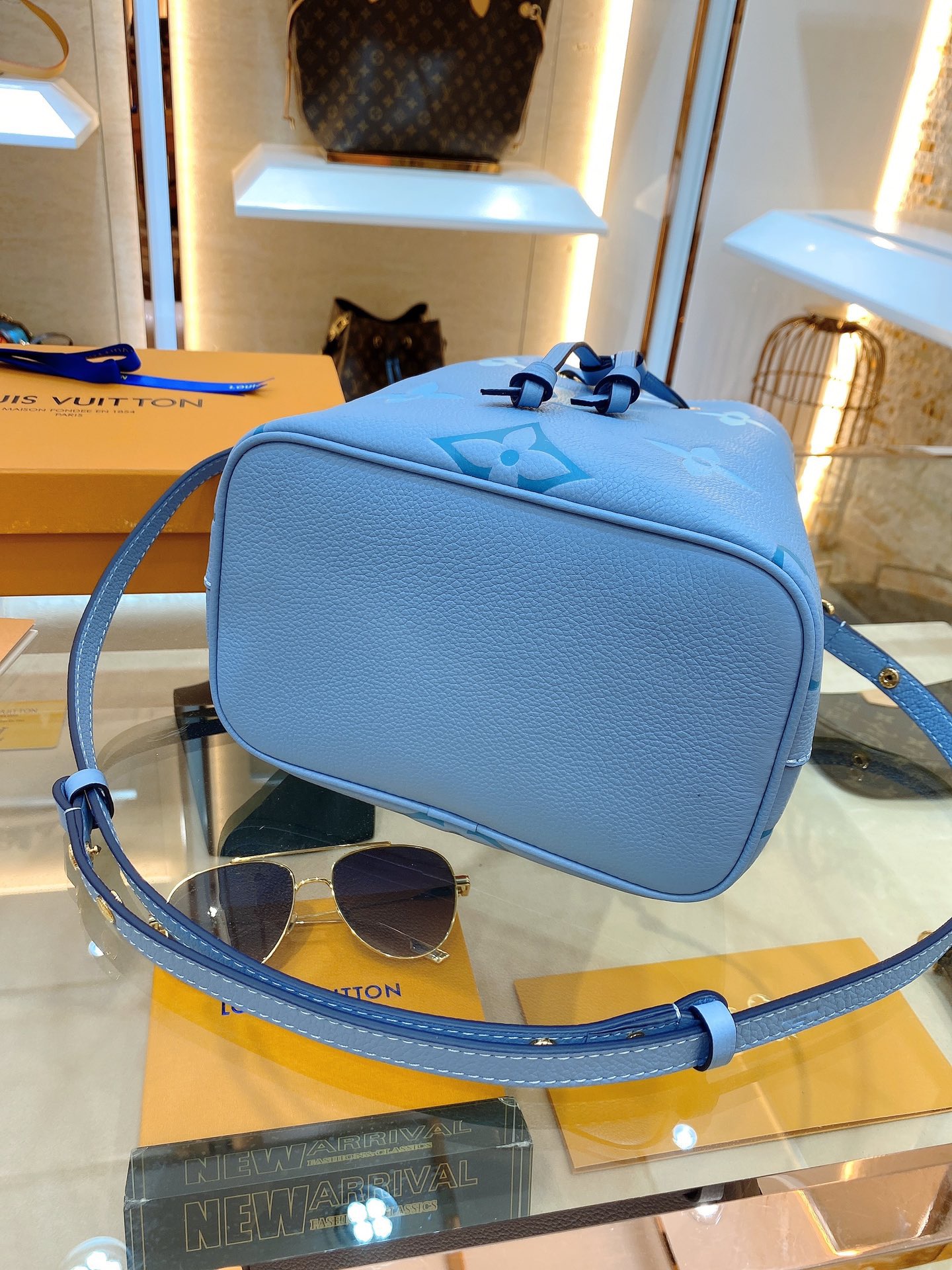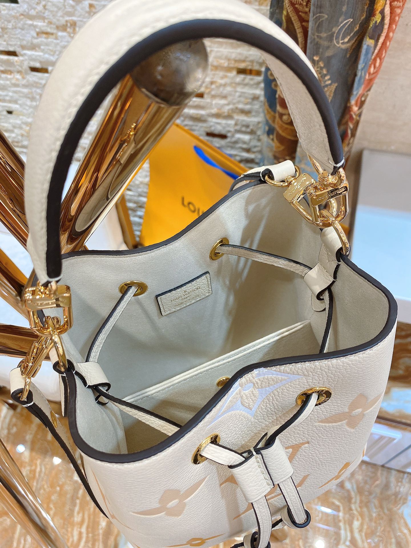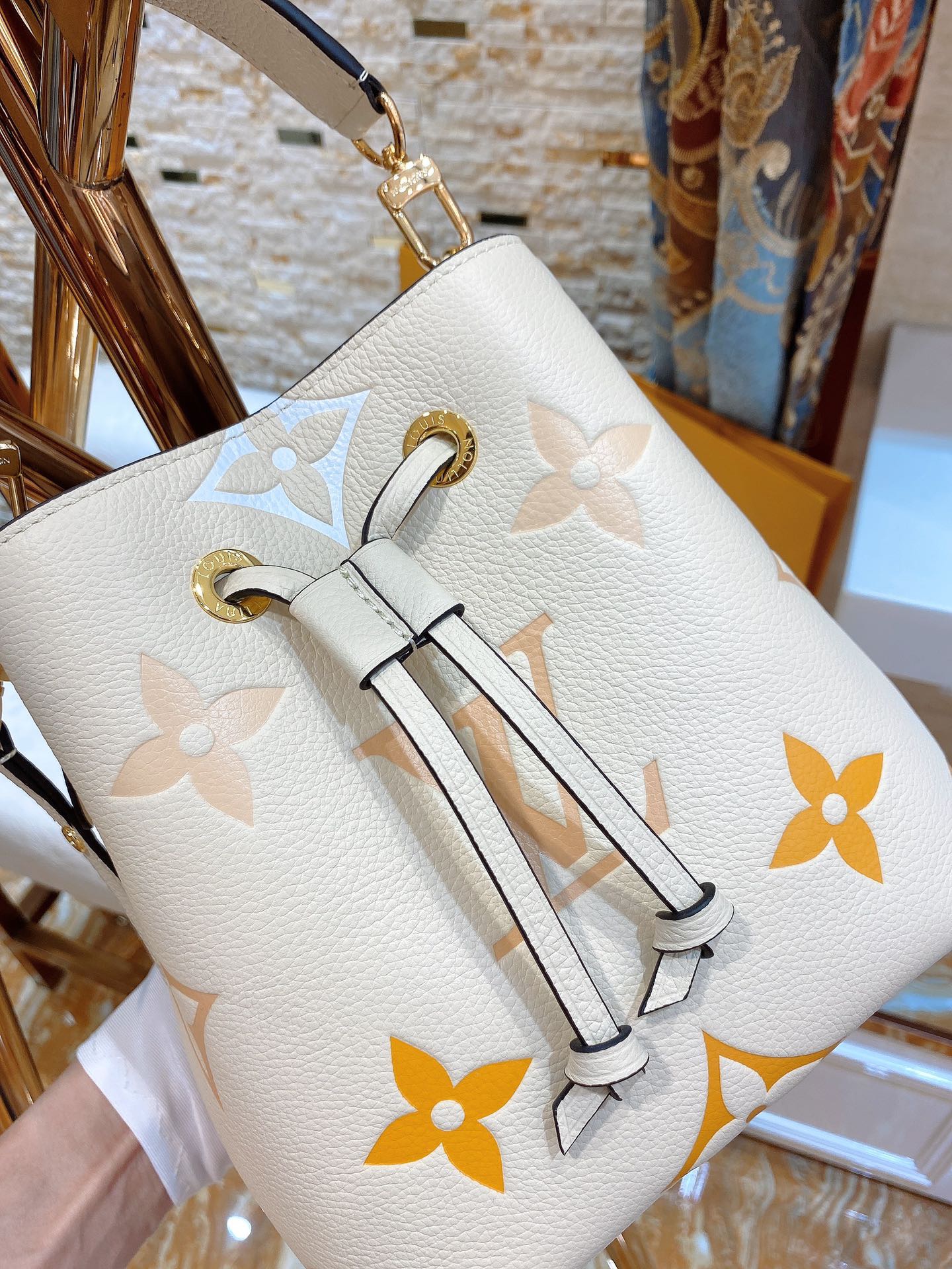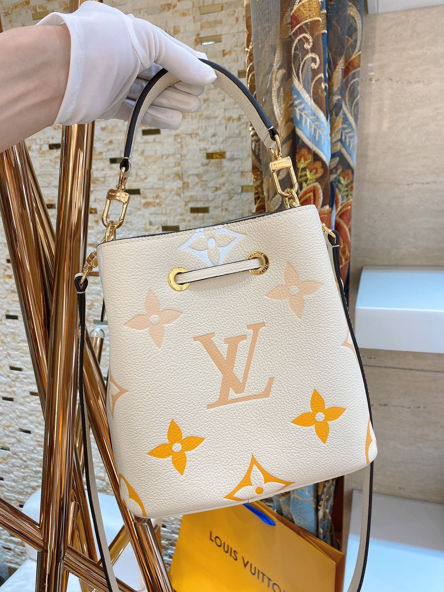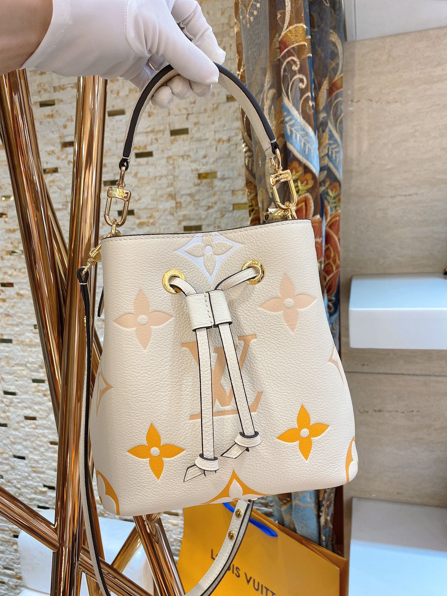 NéoNoé BB. Authentic quality luxury bag crafted in genuine leather comes with authenticity card, dust bag and gift bag.Embrace Festival Vibes with the Stylish NéoNoé BB – A Bucket Bag of Whimsical Pastel Delights!