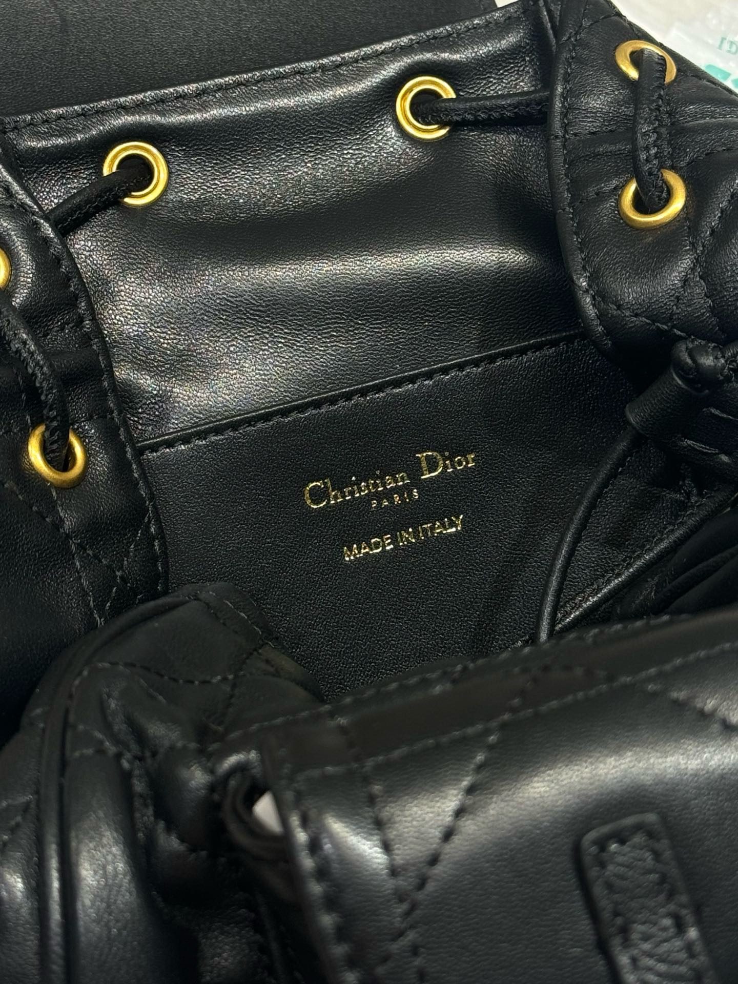 The antique gold-finish ‘CD’ clasp opens to a drawstring main compartment, perfectly balancing beauty and practicality. A discreet flap pocket keeps your daily essentials close at hand, while the top handle and adjustable leather straps offer versatile, all-day comfort.